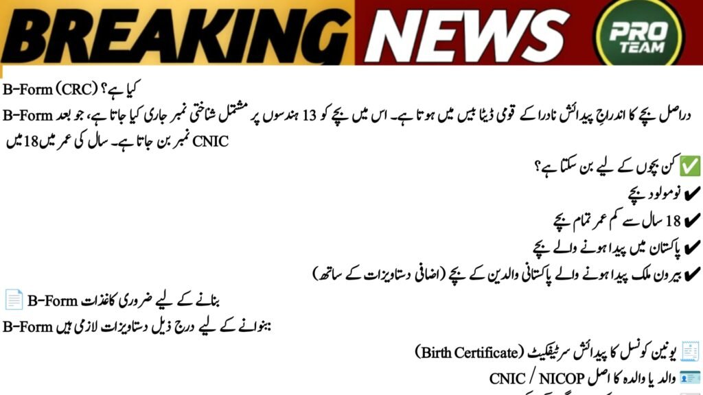 The NADRA B-Form, officially called the Child Registration Certificate (CRC), is the first legal identity document issued to a child in Pakistan. It records the child’s name, date of birth, and parents’ details in NADRA’s national database.