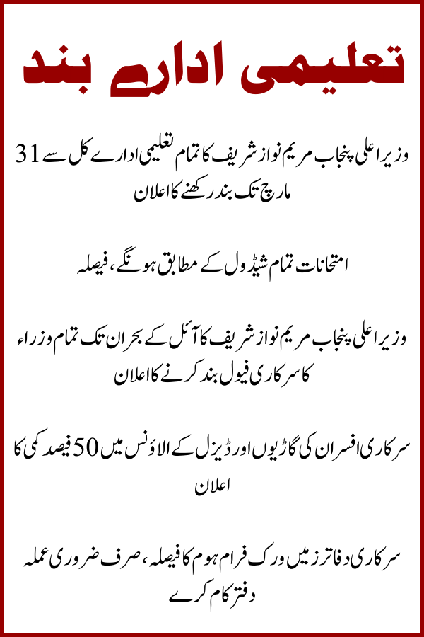 The latest decisions by CM Maryam Nawaz Sharif represent a proactive and responsible approach to a national emergency. Schools Closed till March 31 and cutting government fuel by 50%, the province is setting a standard for energy conservation and fiscal discipline. While these changes may cause temporary shifts in daily routines, they are essential for long-term stability and ensuring that essential services remain uninterrupted for the common man.